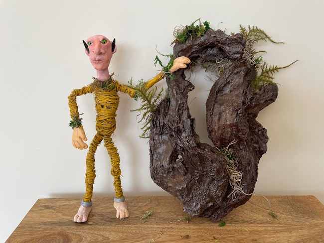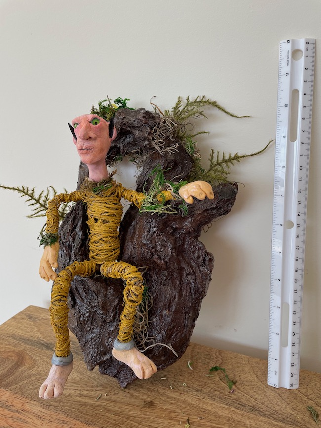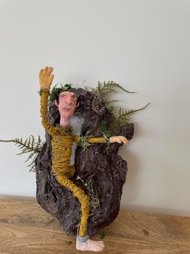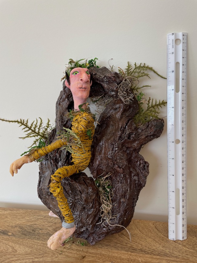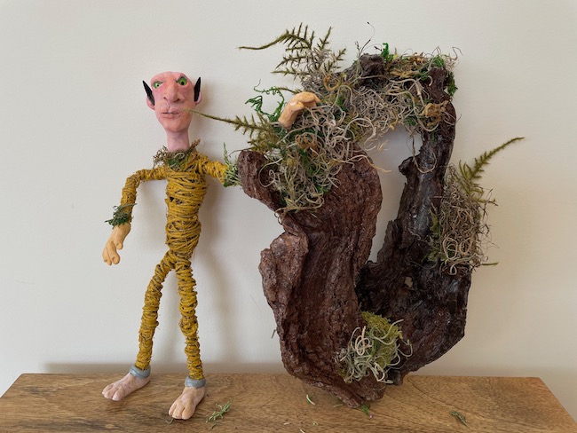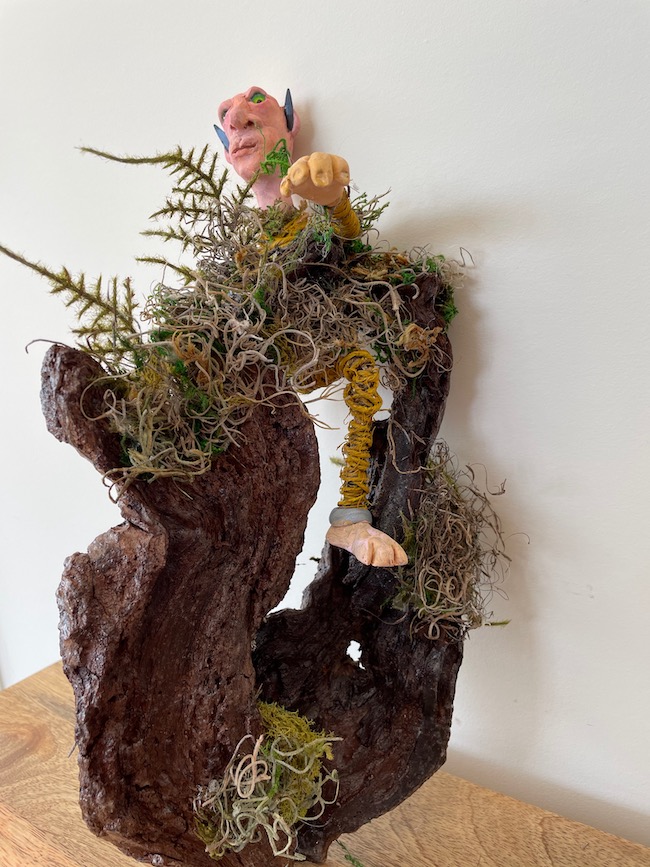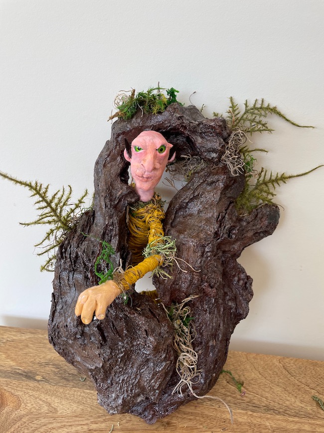 I used a character that I had created for my animation projects. This little guy is peeping through a “window” that I created from two pieces of bark.